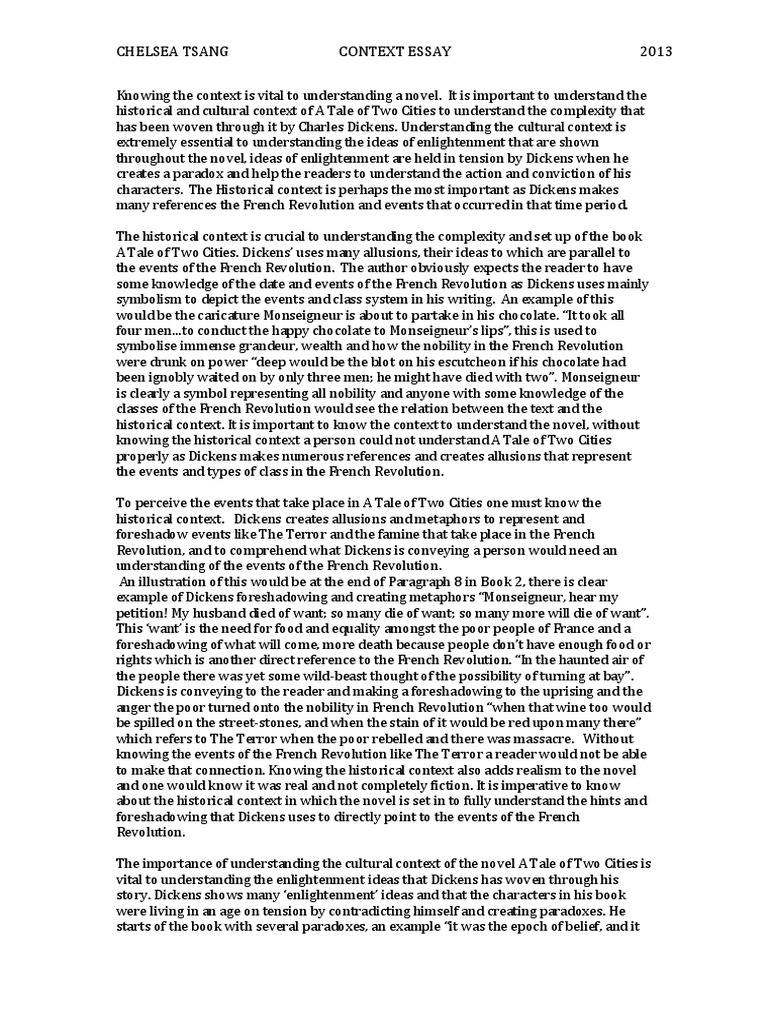 Readers often remember A Tale of Two Cities for its comic-book juxtapositions of good and bad characters, upright citizens and unrepentant sinners. Noble Darnay and vulgar Carton appear to be inverse reflections of each other, their physical Essays on Tale Of Two Cities We found 21 free papers on Tale Of Two Cities Essay Examples Foreshadowing in a Tale of Two Cities Tale Of Two Cities Words: (3 pages) Charles Dickens, Charles Dickens uses foreshadowing to further the plot of the novel. Dickens foreshadows the plot in a number of ways Charles Dickens characterizes the settings in his novel, “A Tale of Two Cities,” through indirect comparison and contrast between Paris and London during the French Revolution, a political and social upheaval from –; “There was a king with a large jaw and a queen with a plain face on the throne of England; there was a king with a large jaw and a queen with a fair